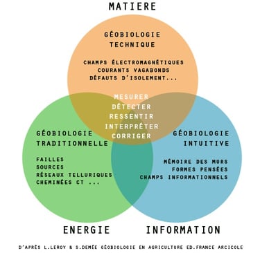 La géobiologie se situe à la croisée de ces différents plans de lecture. Bien qu'elle ne soit pas une science, la démarche d'investigation sur le terrain procède de la même rigueur. Elle est issue de l' art du sourcier, de l'architecture des anciens bâtisseurs, de la physique vibratoire, de la géologie et des techniques intuitives. Elle appréhende un lieu de manière holistique, en mettant l'habitant(e) au cœur de ces différents plans d'énergies sur lesquels le travail d'analyse et de correction va s'effectuer. La géobiologie est une approche sensible de notre environnement. Elle a recours à des outils et des protocoles issus de la radiesthésie. Elle s'appuie également sur des réalités scientifiques et mesurables à l'aide d'appareils techniques. Aujourd'hui la géobiologie moderne tend à appliquer les découvertes dans le domaine des champs informationnels ou champs de torsion, illustrant la théorie de l'intrication quantique. Elle avance à grands pas vers la compréhension de phénomènes mystérieux bien que connus des anciennes traditions. L'important n'est pas de savoir tout expliquer, seul compte le résultat sur le bien-être du Vivant.