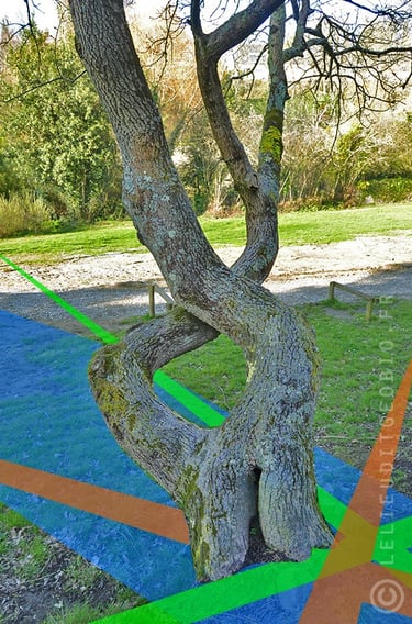 Ce chêne n'a évidemment pas choisi son lieu de vie. Le gland a germé par hasard sur un nœud géopathogène composé de deux croisements Hartmann et Curry à l'aplomb d'un croisement d'eau et d'une faille. L'arbre a adapté sa croissance en fonction et pris la forme de la cheminée cosmo-tellurique négative fixée sur ce point. On distingue à sa base une échancrure dans l'écorce pouvant à terme fragiliser son immunité. Ajoutons que l'arbre est en milieu urbain et subit en plus des courants électriques souterrains ainsi que des hautes fréquences aériennes ! Un bel exemple de ce qu'on appelle l'effet "cocktail" ...